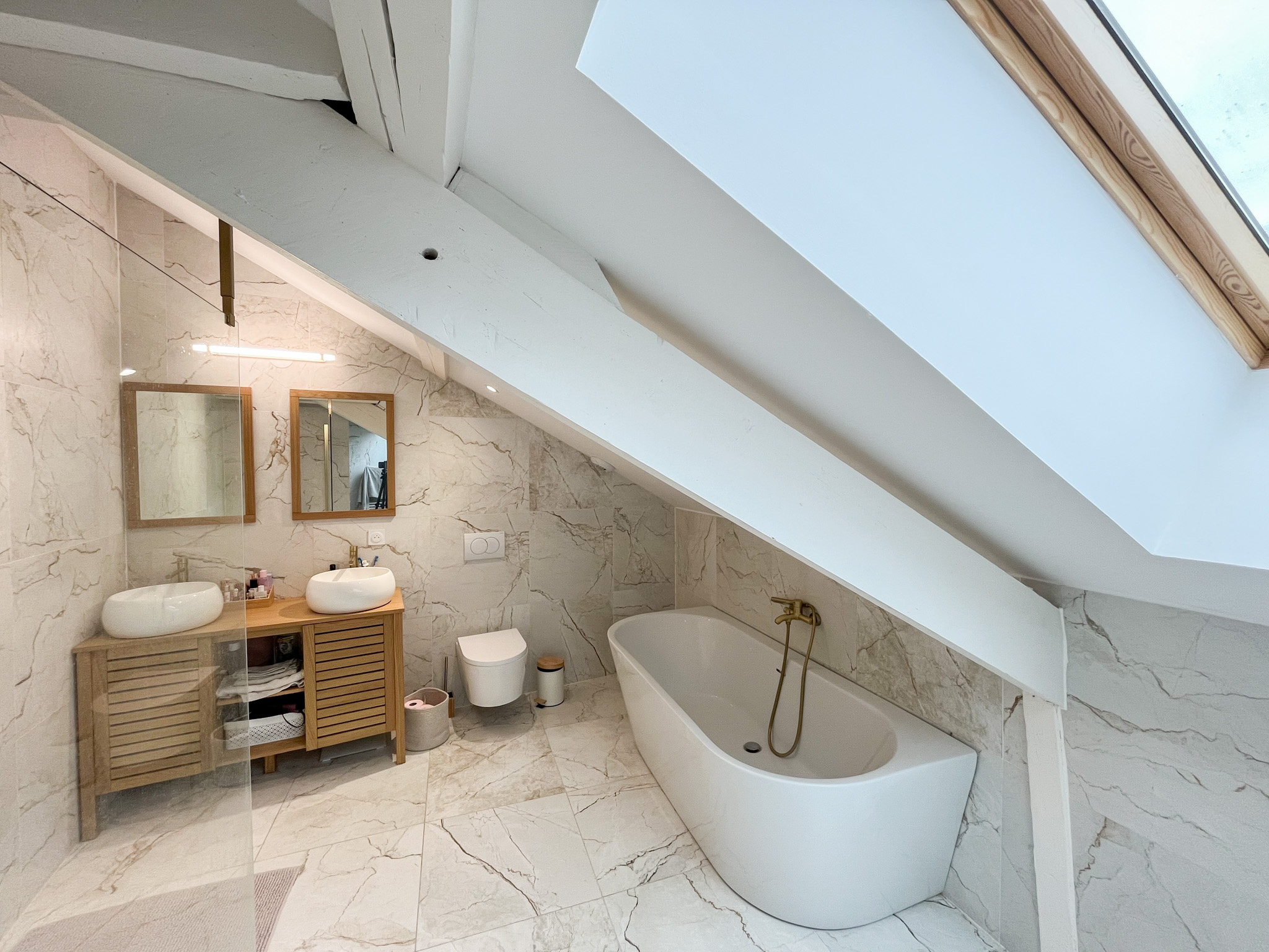 L’espace nuit se compose d’une chambre avec dressing, d’une spacieuse salle de bains avec douche et WC, ainsi que d’une buanderie.