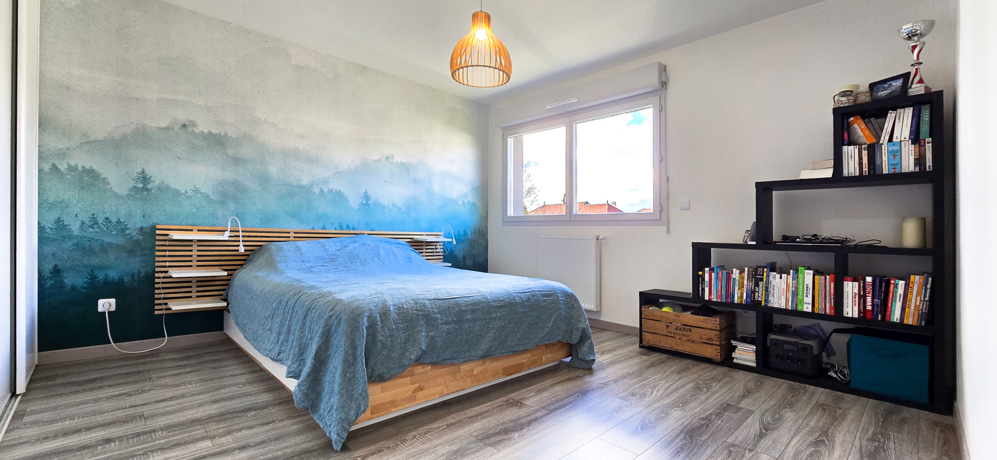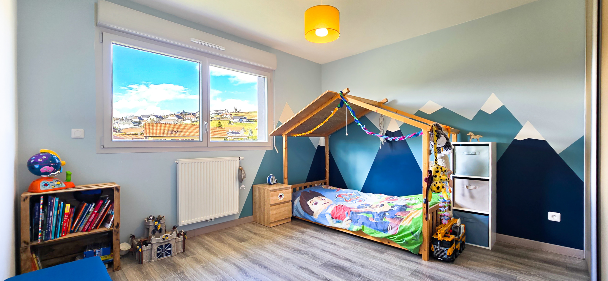 À l’étage, l’espace nuit se compose de trois chambres et d’une salle de bain, offrant un cadre de vie confortable pour une famille.