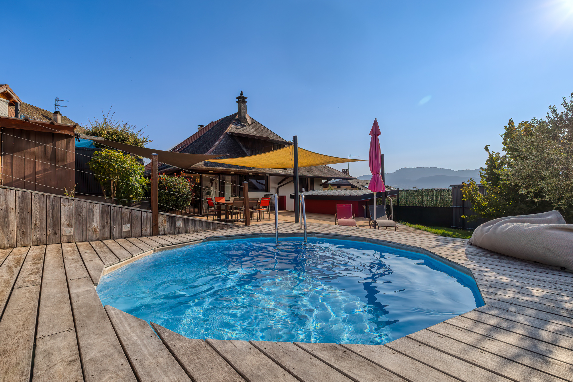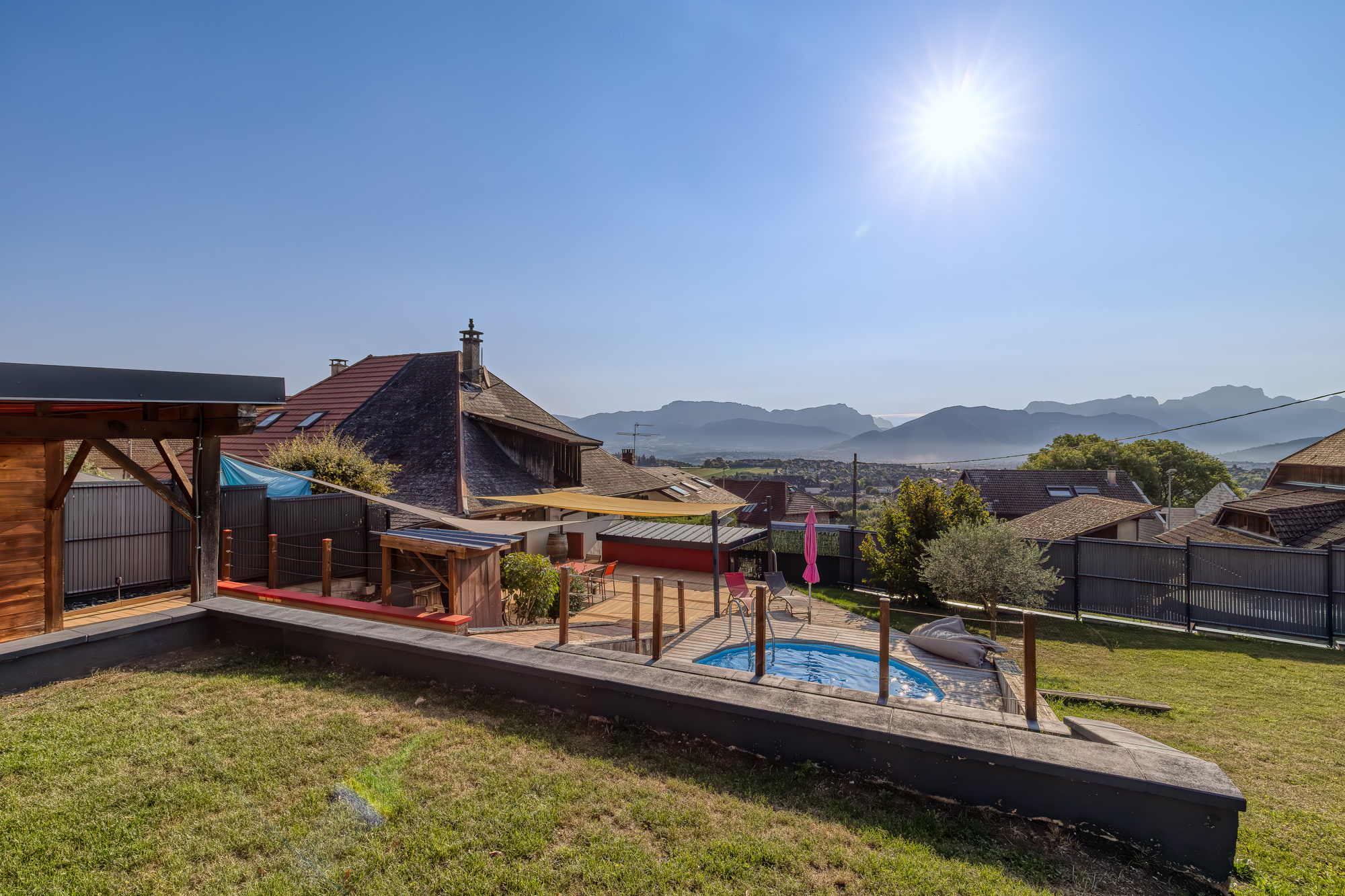 Maison de 4 pièces au calme d’une superficie habitable de 130 m2 édifiée au 19ème siècle sur une parcelle constructible et piscinable de 635 m2. La maison bénéficie d’une entrée par un jardin clos d’environ 500 m2 avec une double terrasse de plus de 100 m2 ainsi qu’une piscine semi-enterrée sans vis-à-vis bénéficiant d’une vue dégagée sur le Mont Blanc, le Veyrier, le Parmelan, la Tournette et le lac.