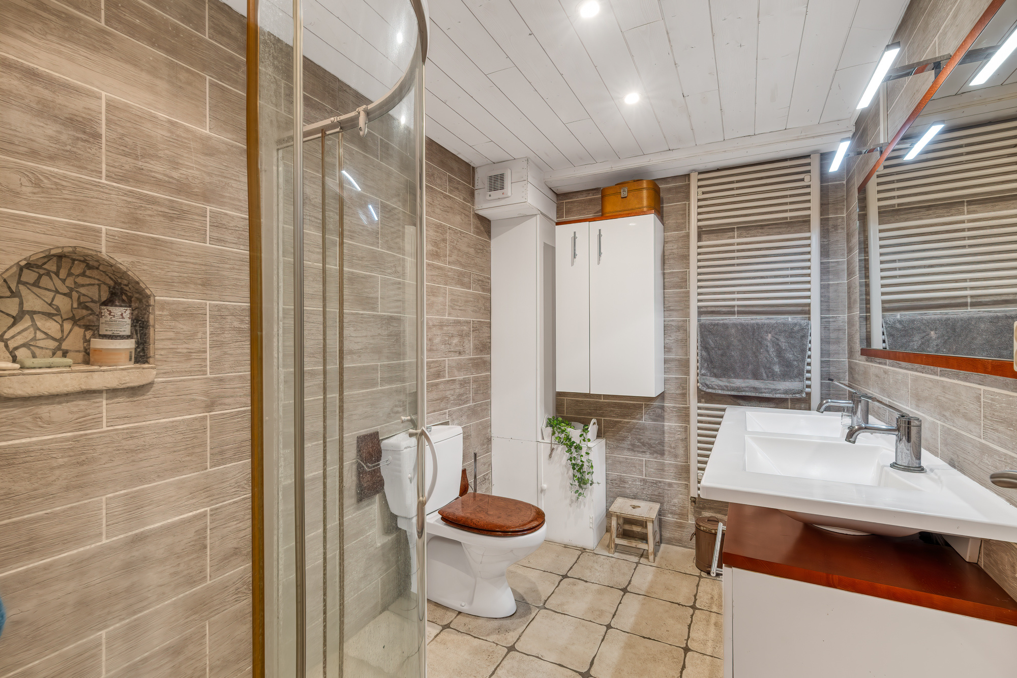La maison dispose d’une entrée sur une cuisine ouverte sur le séjour avec un accès à un balcon privé, un WC et une grande chambre disposant d’un accès au jardin. Située dans l’espace inférieur de la maison, celle-ci dispose de deux autres chambres et d’une salle d’eau avec WC.