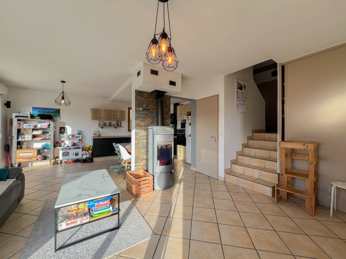 La maison se compose au rez-de-chaussée d’un placard de rangement dans l’entrée, d’une belle pièce de vie très lumineuse avec une cuisine ouverte entièrement équipée, et deux baies vitrées donnant sur une grande terrasse exposée Sud-Ouest et le jardin sans vis-à-vis.