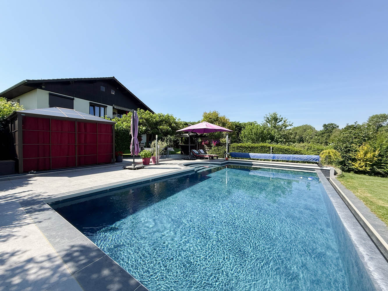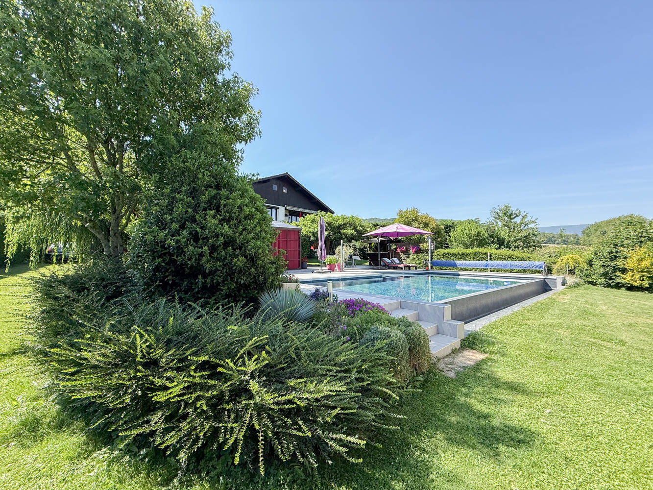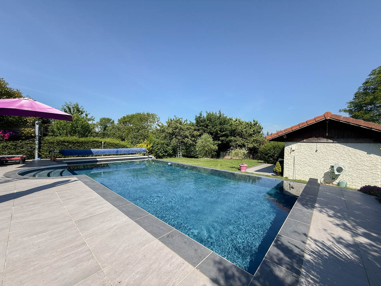 Cette maison dispose d’un grand terrain plat, clôturé et au calme sans vis-à-vis d’une superficie de 1 600m2 comprenant une piscine creusée et chauffée ainsi qu’un espace spa avec jacuzzi.
