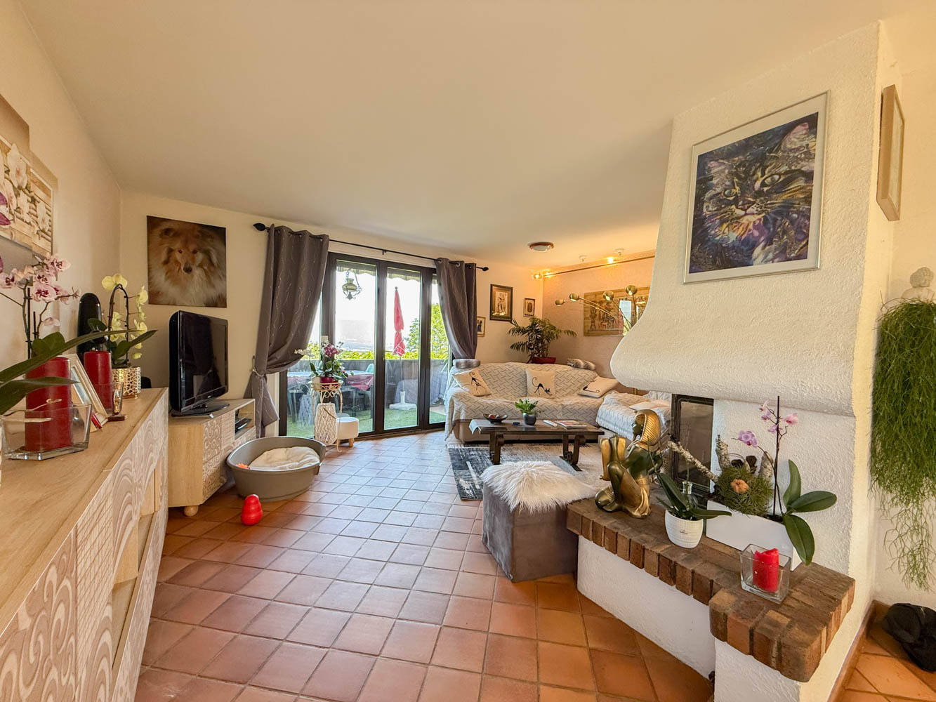 Au premier étage la maison dispose de trois chambres, d’une cuisine semi-ouverte sur un spacieux et lumineux séjour donnant accès à une large terrasse avec une vue dégagée sur le jardin de la propriété.